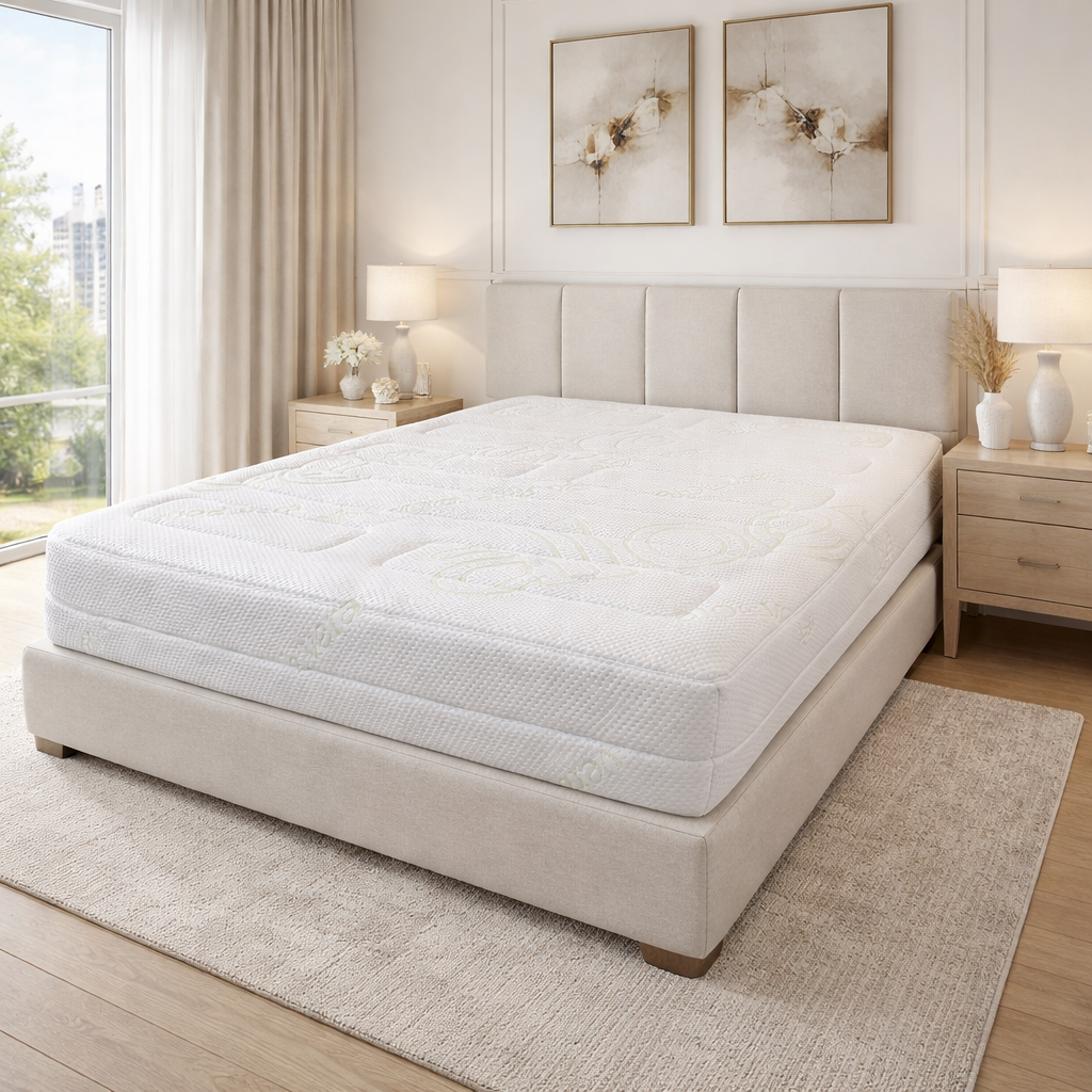 Il topper in schiuma viscoelastica Memory, con densità di 55 Kg/m3 e spessore di 4 cm, garantisce flessibilità ed elasticità naturali. Insieme al nucleo a molle, crea una superficie di riposo ideale e confortevole.